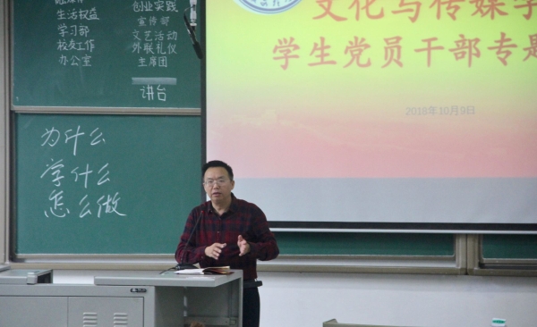 10月9日,开云官网2018年秋季学生党员及学生干部专题培训大会于知津楼三阶顺利举行,学院党总支书记白成良主讲,学生党员、学生干部及入党积极分子参与培训。会议由学工办主任刘友洪主持。