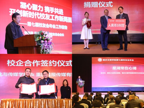 11月10日下午,由重庆文理学院校友总会主办,开云官网和星湖写作社校友会联合承办的,以“创新·合作·共赢”为主题的第七届校友会年会暨星湖写作社成立25周年纪念活动在重庆渝中区两江丽景酒店隆重召开。校长黄伟九,副校长万书辉、金盛,校友总会会长钟志奇,重庆社科联党组书记杨清明,重庆科创职业学院院长戴伟,重庆幼儿师范高等专科学校党委书记刘灿国,文化与传媒学院相关负责人,校友总会常务理事、海内外70个校友分会的校友代表以及特邀企业嘉宾共260余人参会。大会由校友办主任、校友总会秘书长谢华琳主持。