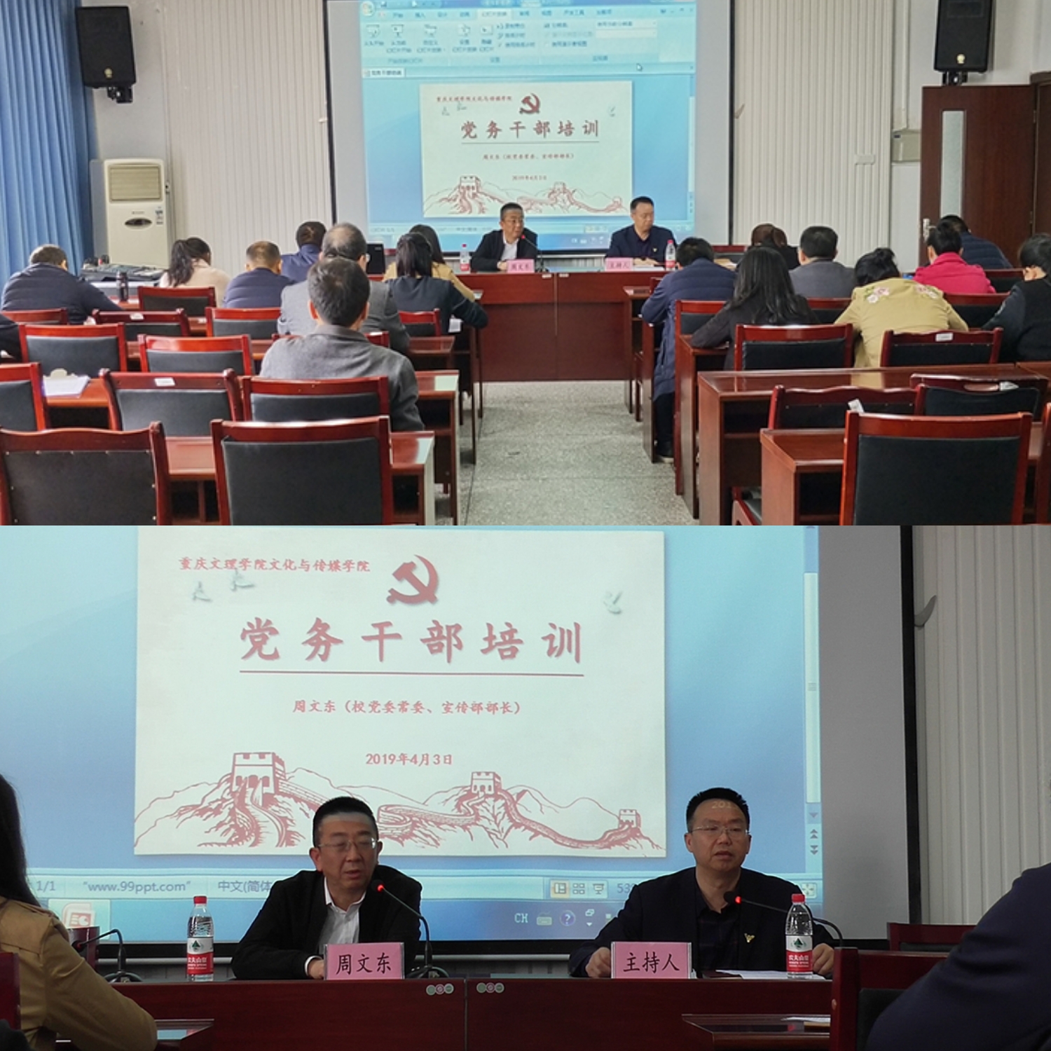 2019年4月3日,重庆文理学院文化与传媒学院党务干部培训会在知津楼文传学院大会议室举行。全体党总支委员,各支部书记及支委参会。本次会议由党总支书记白成良同志主持。