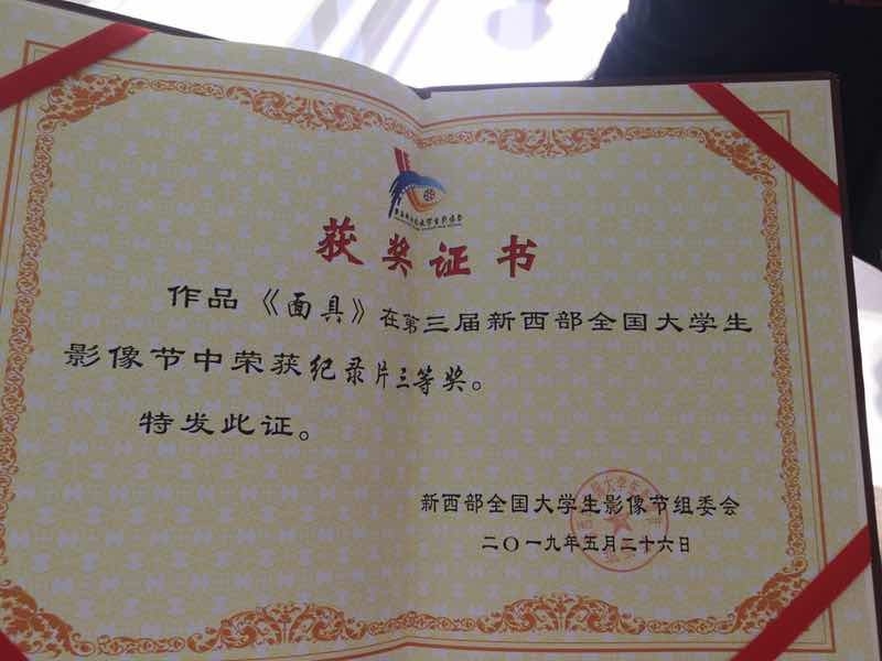 5月26日下午,第三届新西部全国大学生影像节颁奖盛典在西北大学现代学院隆重举行,开云官网2015级广播电视编导专业刘爽、汪施羽创作的纪录片《面具》(指导老师:陈怡冰)获得纪录片单元三等奖。