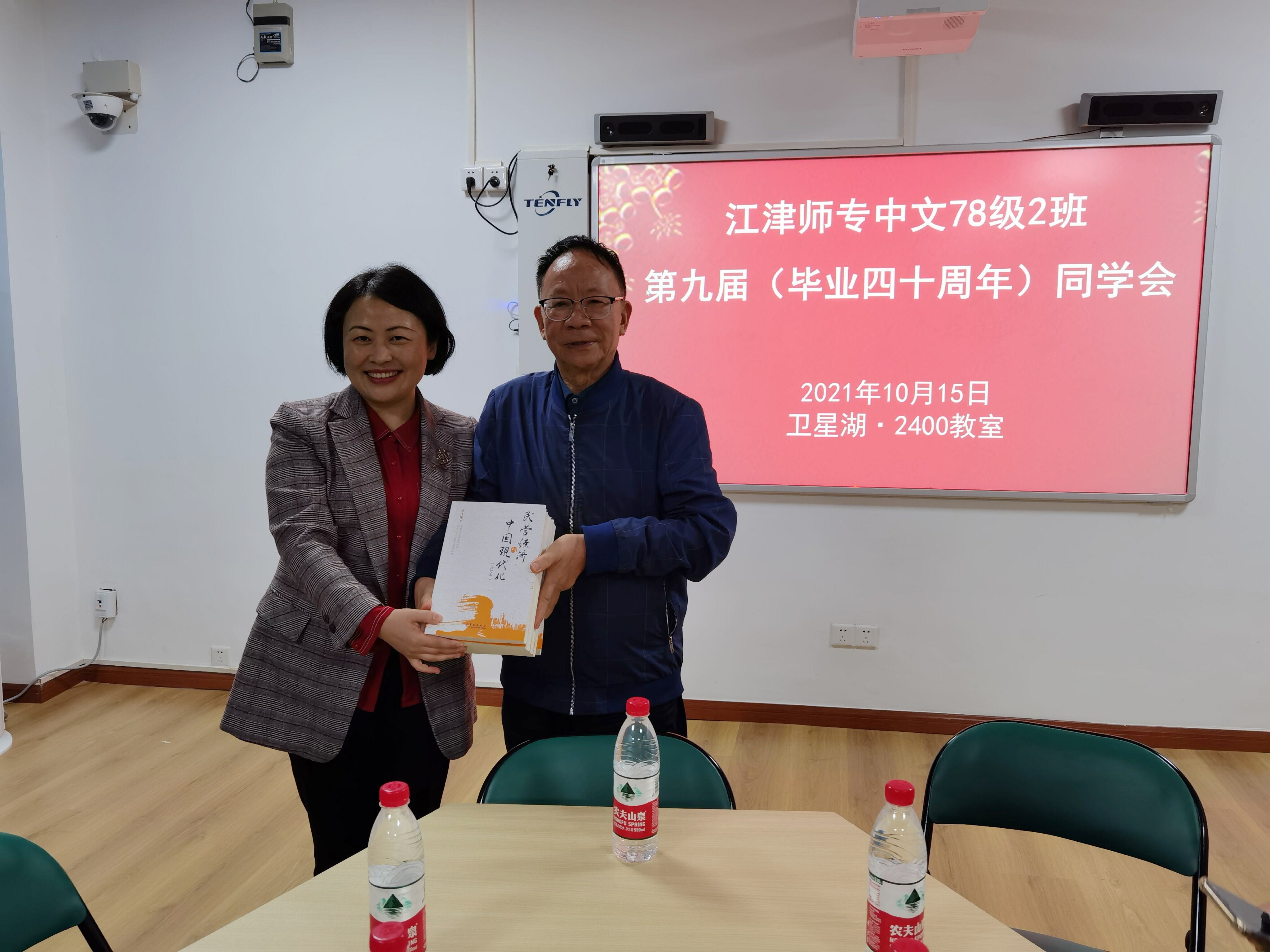 10月15日晚上,中文78级2班37名校友相聚母校卫星湖校区2400教室举行毕业四十周年座谈会,重温青春岁月,再叙同学情谊。文化与传媒学院院长、校友会会长李芹燕,党总支副书记、校友会副会长邱飞,以及中文78级2班校友参加座谈。原校图书馆支部书记蒋永平校友主持会议。