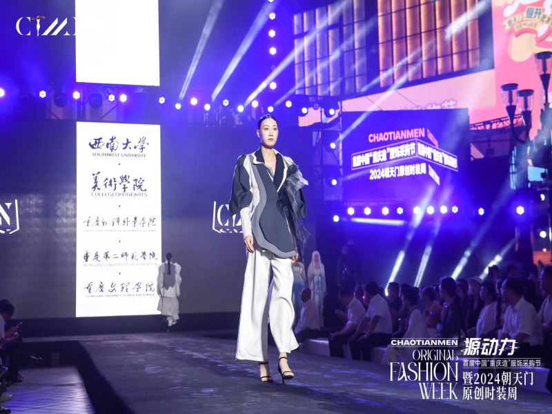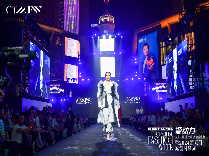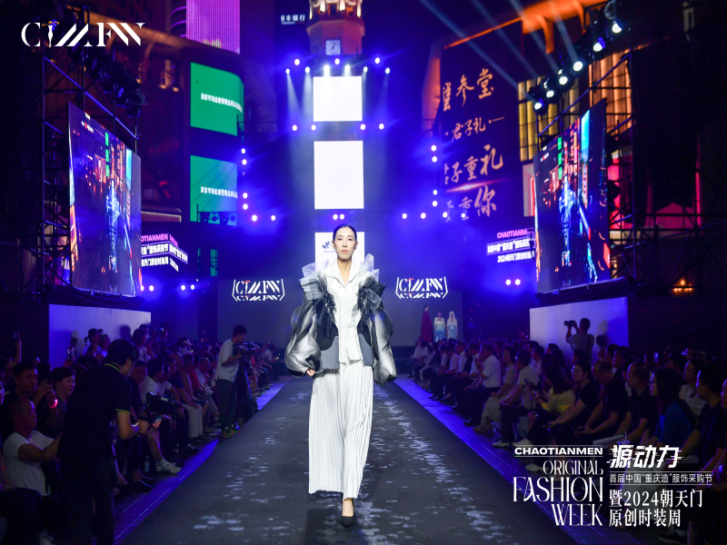 9月10日晚,随着解放碑20:00整点钟声的敲响,中国“重庆造”服饰采购节暨2024朝天门原创时装周在解放碑十字金街正式拉开帷幕,全国各地的行业商协会代表、专业市场、设计院校、生产性厂家以及代理商、买手汇聚一起,共同见证了这一时尚盛事的启幕。在开幕大秀上,包括我校在内的五所本土服装高校带来了精彩的作品展示,彰显了“重庆造”设计研发人才链的供给实力!